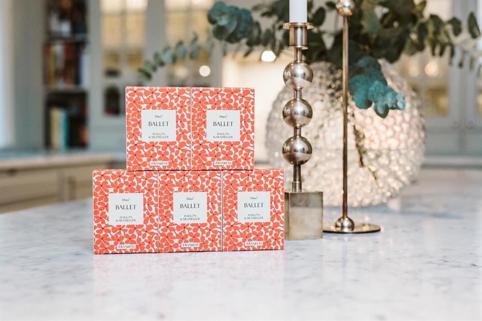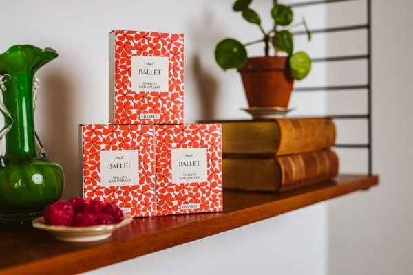 Hallonkarameller i lyxig kartong med motivet ”Ballet” designat av Stig Lindberg.