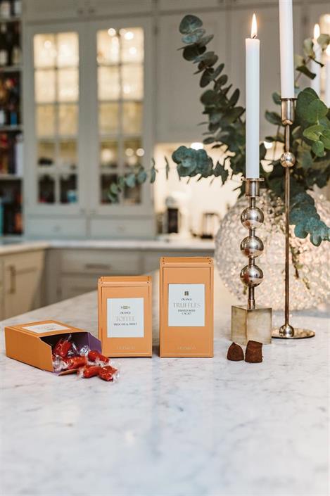 Chokladtryfflar med smak av apelsin i lyxig förpackning.