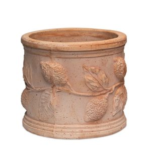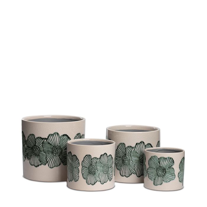 Cylinderformad kruka med blommotiv i retrokänsla! Passar lika bra till grönväxter som till mårbackapelargonen.