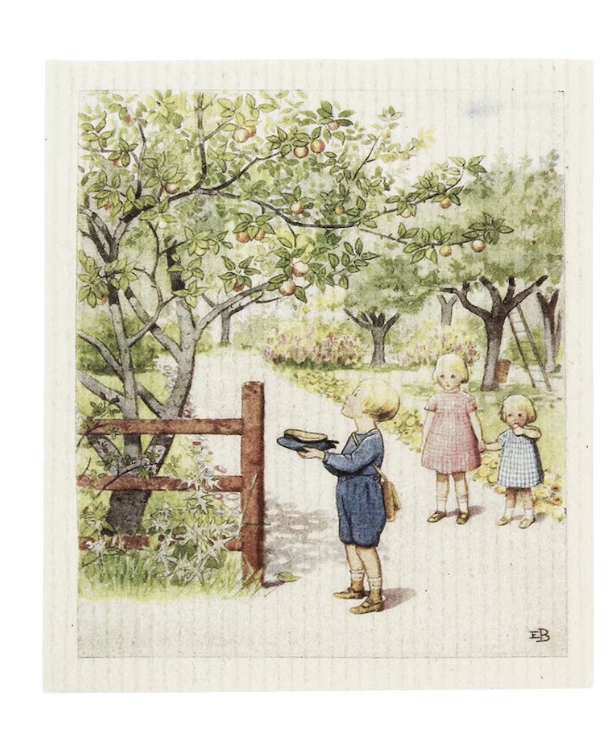 Klassisk, svensktillverkad wettextrasa i 70 % cellulosa och 30 % bomull, med ett charmigt motiv av en pojke i en äppellund. Konstverket är av Elsa Beskow, en av Sveriges mest älskade illustratörer och barnboksförfattare.