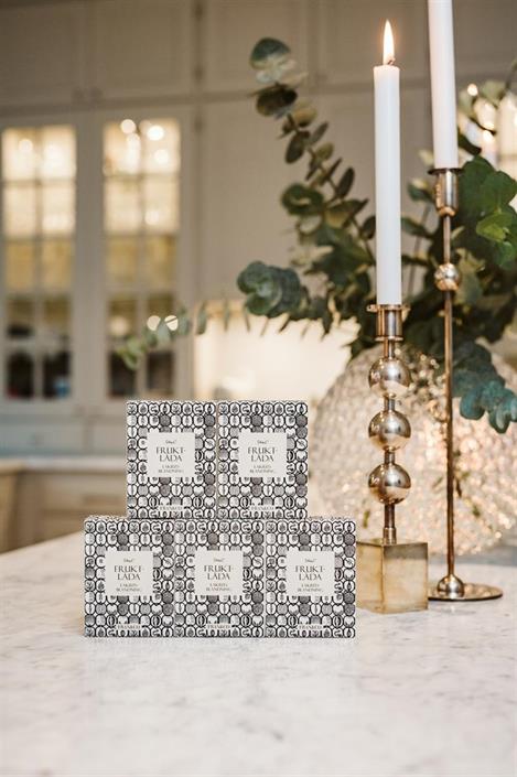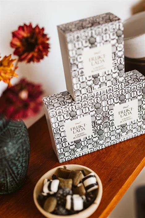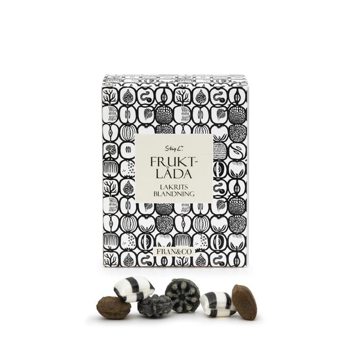 Lakritskarameller i lyxig förpackning med mönstret ”Fruktlåda” designat av Stig Lindberg.