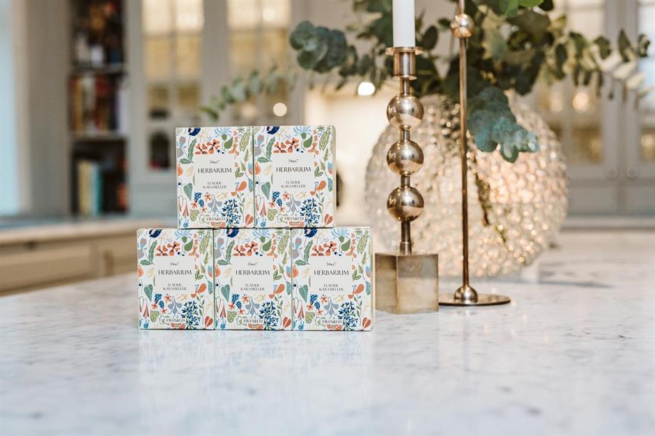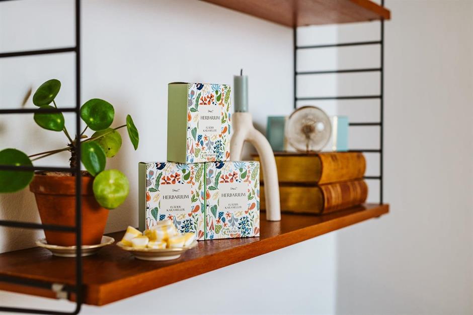 Fläderkarameller i lyxig förpackning med motivet ”Herbarium” designat av Stig Lindberg.