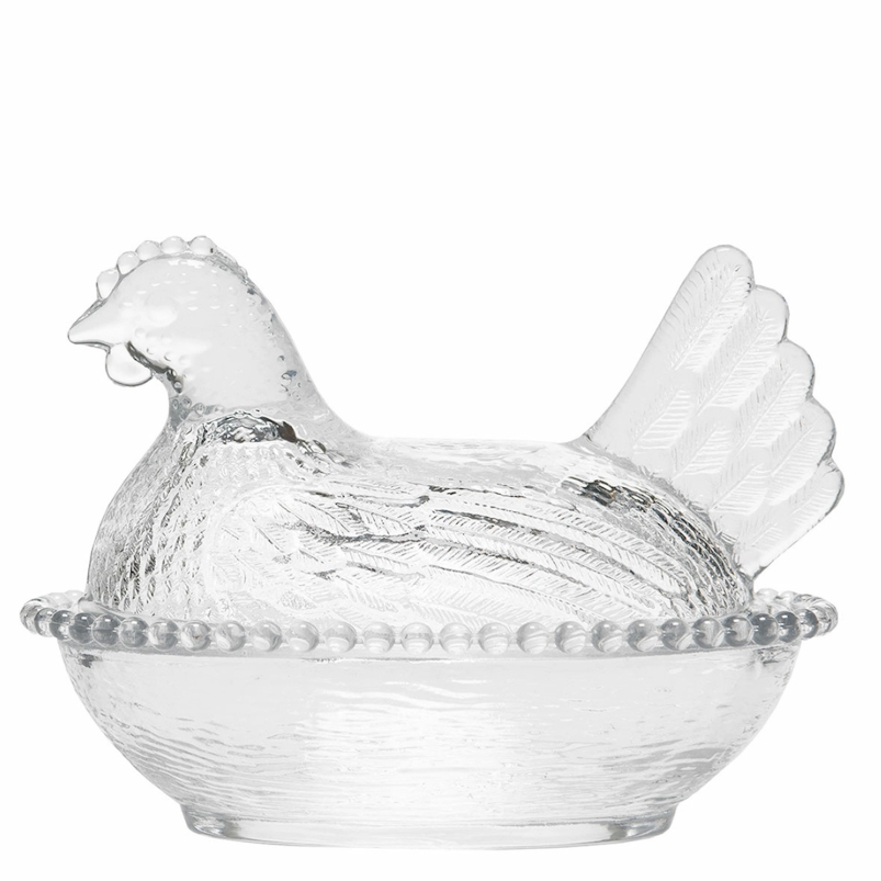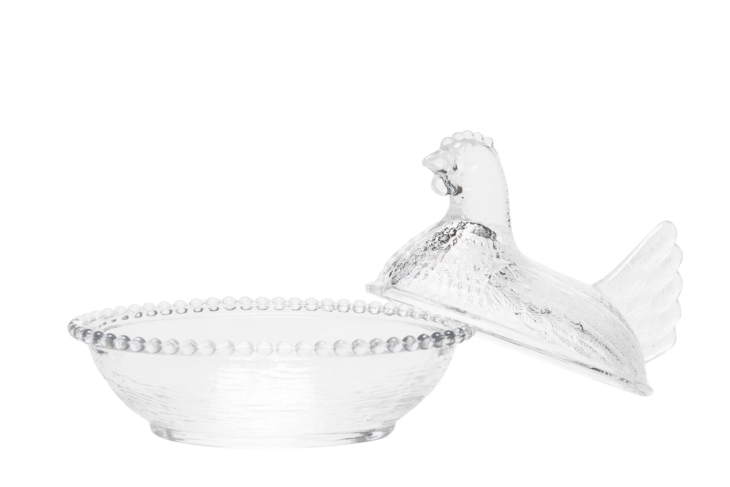 Dekorera för påsken och ställ fram till lite påskgodis i denna glasskål med lock som ser ut som en höna.