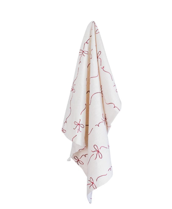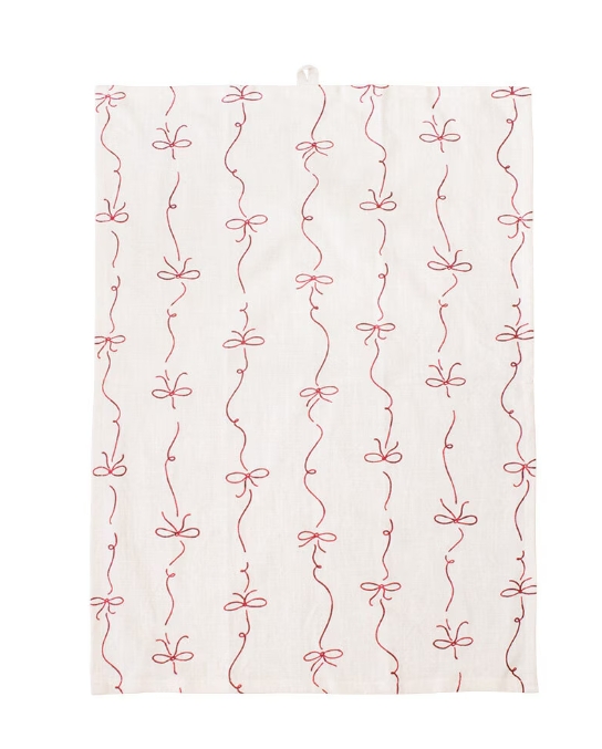 Kökshandduk i 100% ekologisk bomull med röda rosetter. Band i ena hörnet för upphängning. Fint att kombinera tillsammans med de andra textila delarna med rosetter.