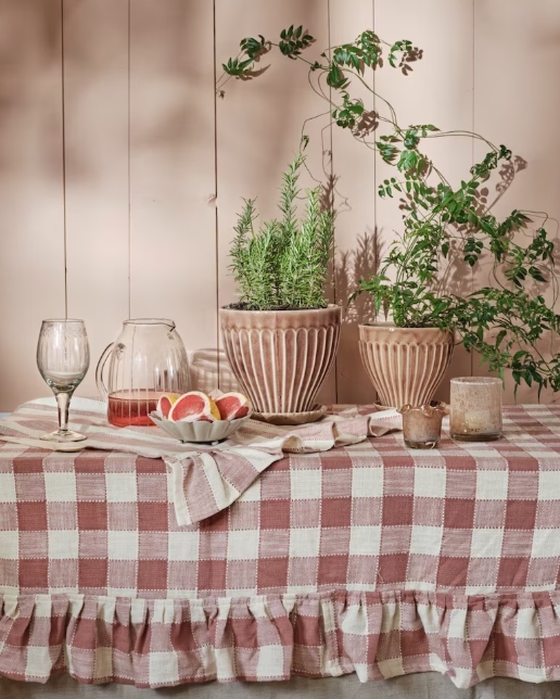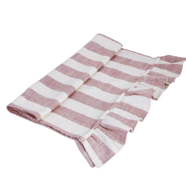 Duk i 100% ekologisk bomull i en mjuk rosa nyans med med bredrandigt mönster och en vacker volang. Jättefin att matcha med andra produkter i samma serie.