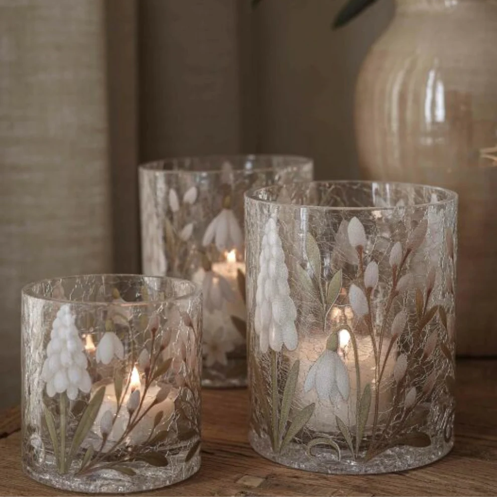Majas Lykta Pärlisar är en handgjord krackelerad glaslykta med ett vackert och stämningsfullt mönster av pärlhyacinter, videkvistar och snöklockor. En lykta som sprider ett mjukt, varmt ljus och skapar en rofylld atmosfär i hemmet.