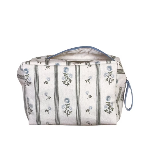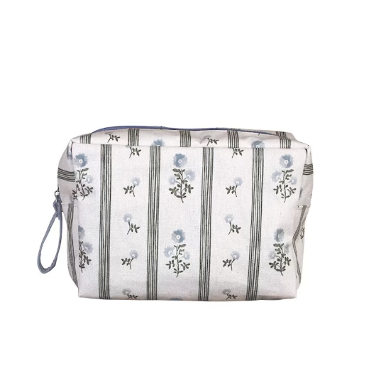 Liten necessär eller sminkväska i bomull med underbart blommönster i vintagestil. Necessären har en dovt blå dragkedja och har en insida med smutsavvisande, avtorkningsbar yta samt en extra innerficka med dragkedja.  En perfekt rese-necessär som rymmer alla dina viktigaste hygienartiklar.