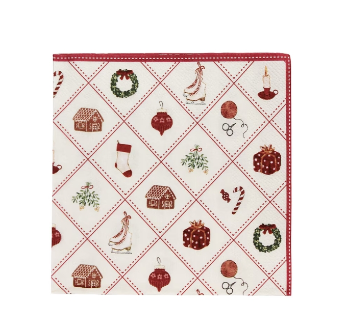 Högkvalitativa pappersservetter i charmigt julmotiv, gjorda av FSC-certifierat papper. Varje servett mäter 33 x 33 cm och är tryckt på ena sidan med livsmedelssäkra, vattenbaserade tryckfärger. Förpackning innehåller 20 st servetter. Perfekt att duka med till julbordet, för evenemang eller vardagsbruk.