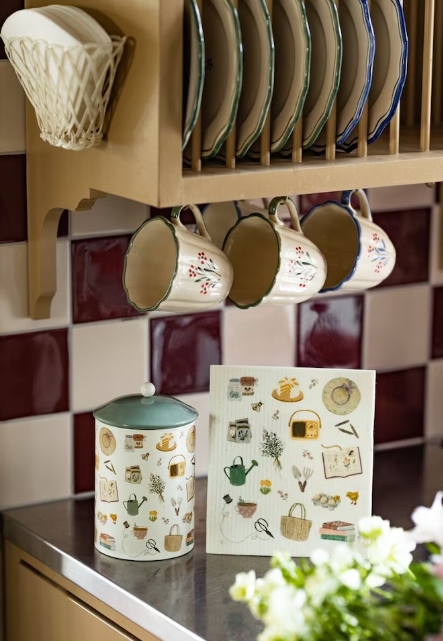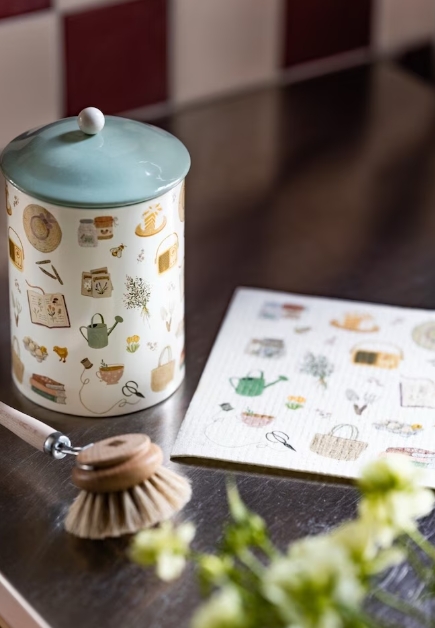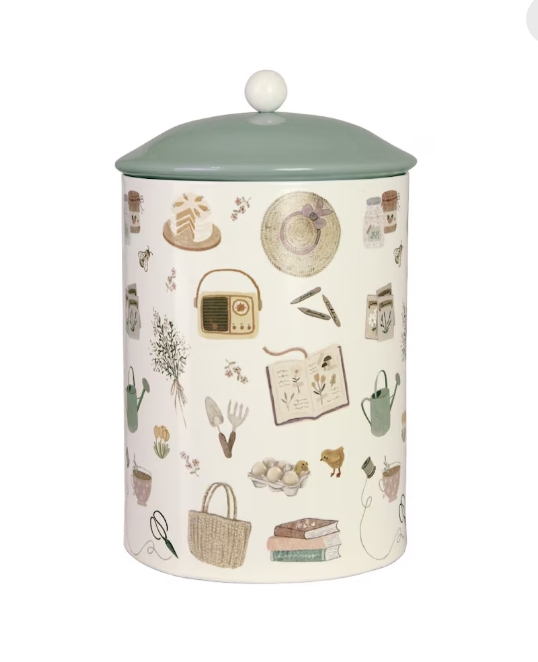 Plåtburk med motiv av små söta trädgårdsprylar. Lock i grönt med en rund vit knopp.
