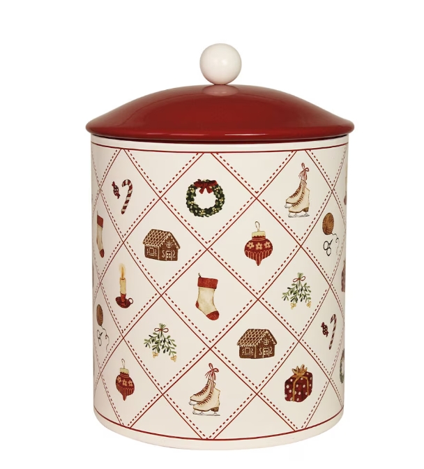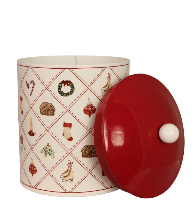 Plåtburk med nostalgiskt julmotiv. Finns i två storlekar. Använd burken till pepparkakor, småkakor, julgodis eller annat gott. Lock i rött med en rund knopp. Silikonring som gör att locket sitter stadigt och sluter tätt.