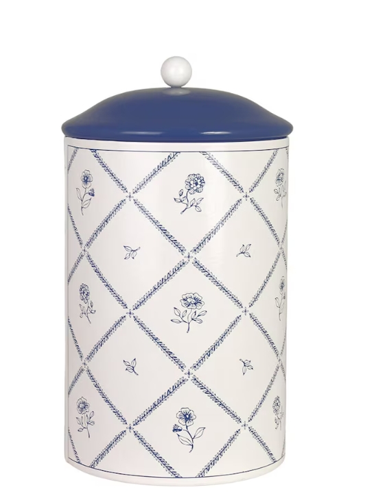 Stor plåtburk med ett charmigt blomstermönster. Lock i blått med en rund vit knopp. Finns i två storlekar. Matchar fint med Lovisa textilserie.