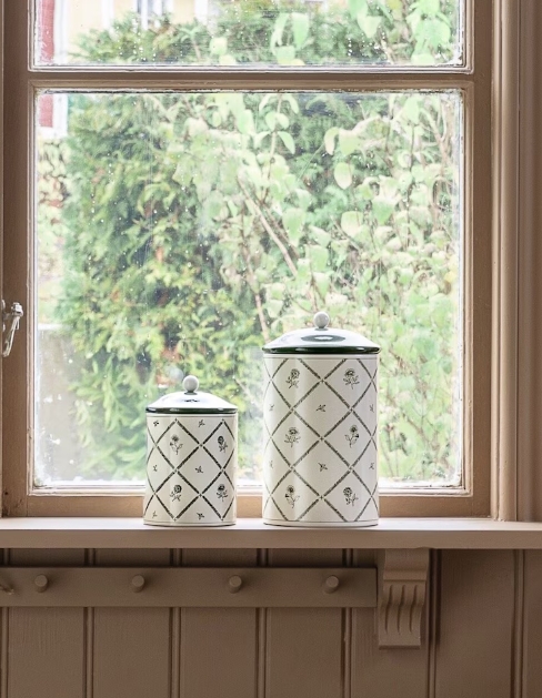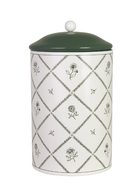 Stor plåtburk med ett charmigt blomstermönster. Lock i grönt med en rund vit knopp. Finns i två storlekar. Matchar fint med Lovisa textilserie.