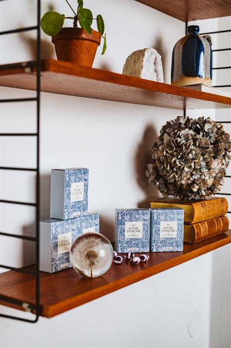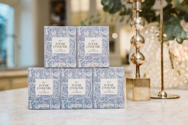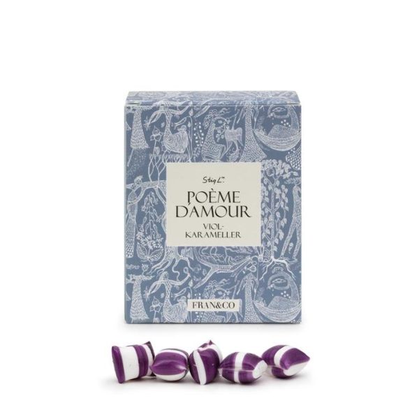 Violkarameller i lyxig förpackning med mönstret ”PoémeD`amou” designat av Stig Lindberg.