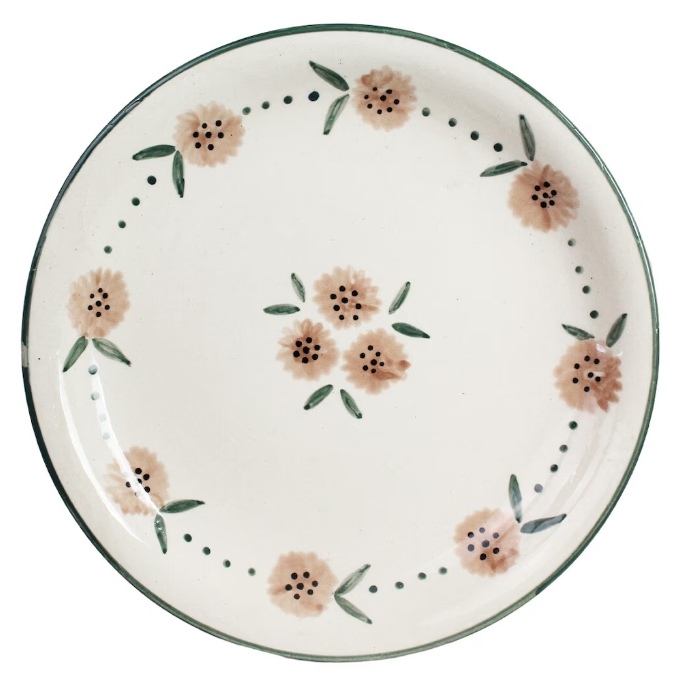 Elegant serveringsfat i keramik som pryds av ett handmålat blomstermönster med mjuka rosa blommor och gröna blad. Fatet är perfekt för att duka upp sallader, pasta eller andra läckra rätter och ger en charmig och färgstark touch till bordet.