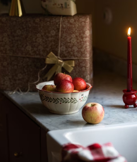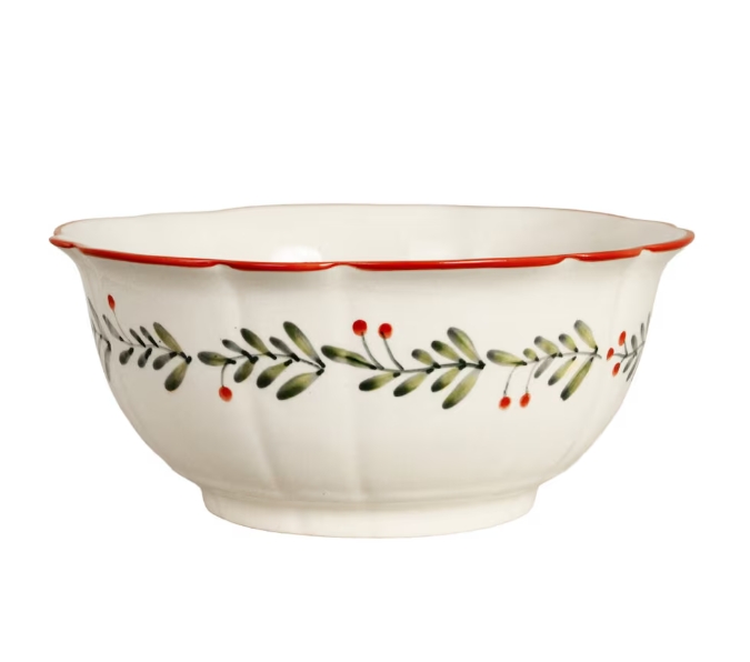 Vacker skål i stengods med handmålat mönster av blad och lingon – ett mönster som för tankarna till en traditionell jul, fylld av värme och nostalgi. Perfekt till julens alla serveringar, från risgrynsgröt till sallader. Skålen är fin att kombinera med andra delar ur serien Esther Lingon för en enhetlig dukning.
