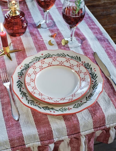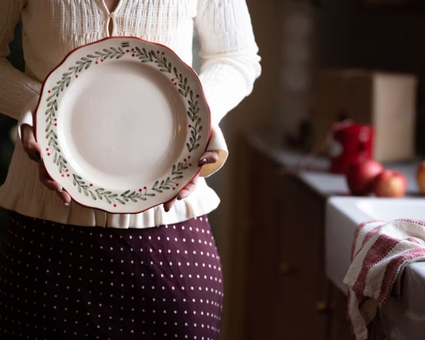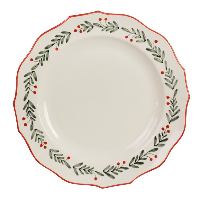 Vacker tallrik i stengods med handmålat mönster av blad och lingon – ett mönster som för tankarna till en traditionell jul, fylld av värme och nostalgi. Perfekt till julens alla serveringar. Tallriken är fin att kombinera med andra delar ur serien Esther Lingon för en enhetlig dukning.