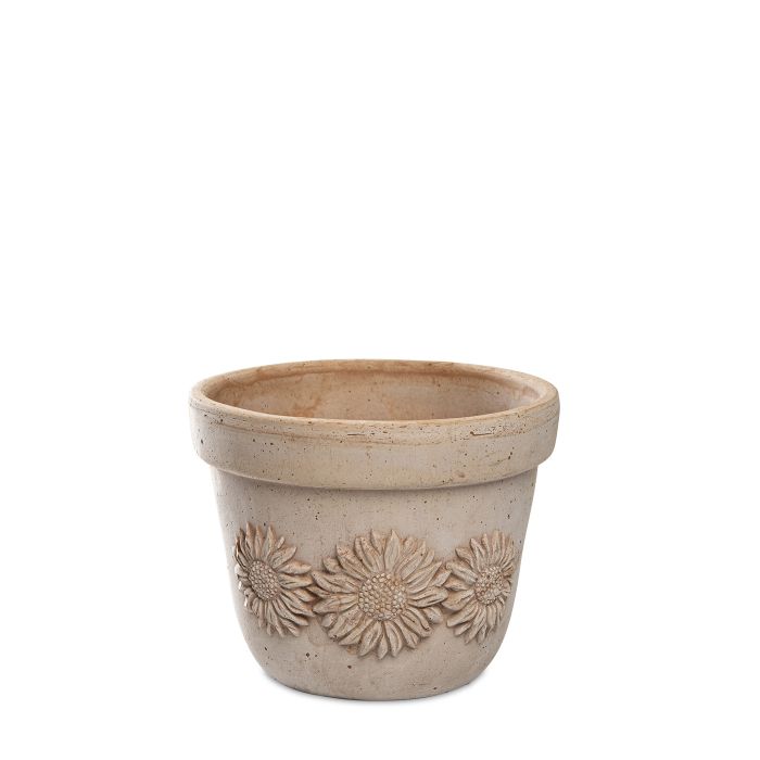 Läcker lerkruka med solrosmotiv som genast för tankarna till det varma medelhavet!