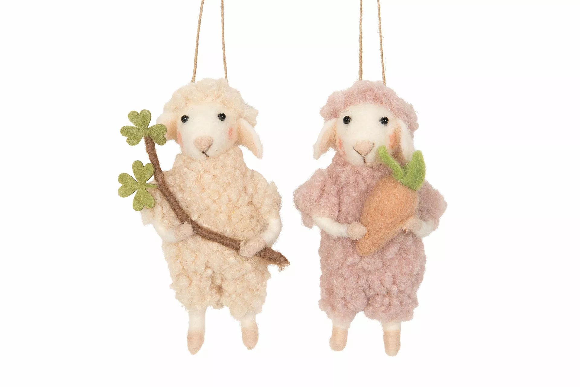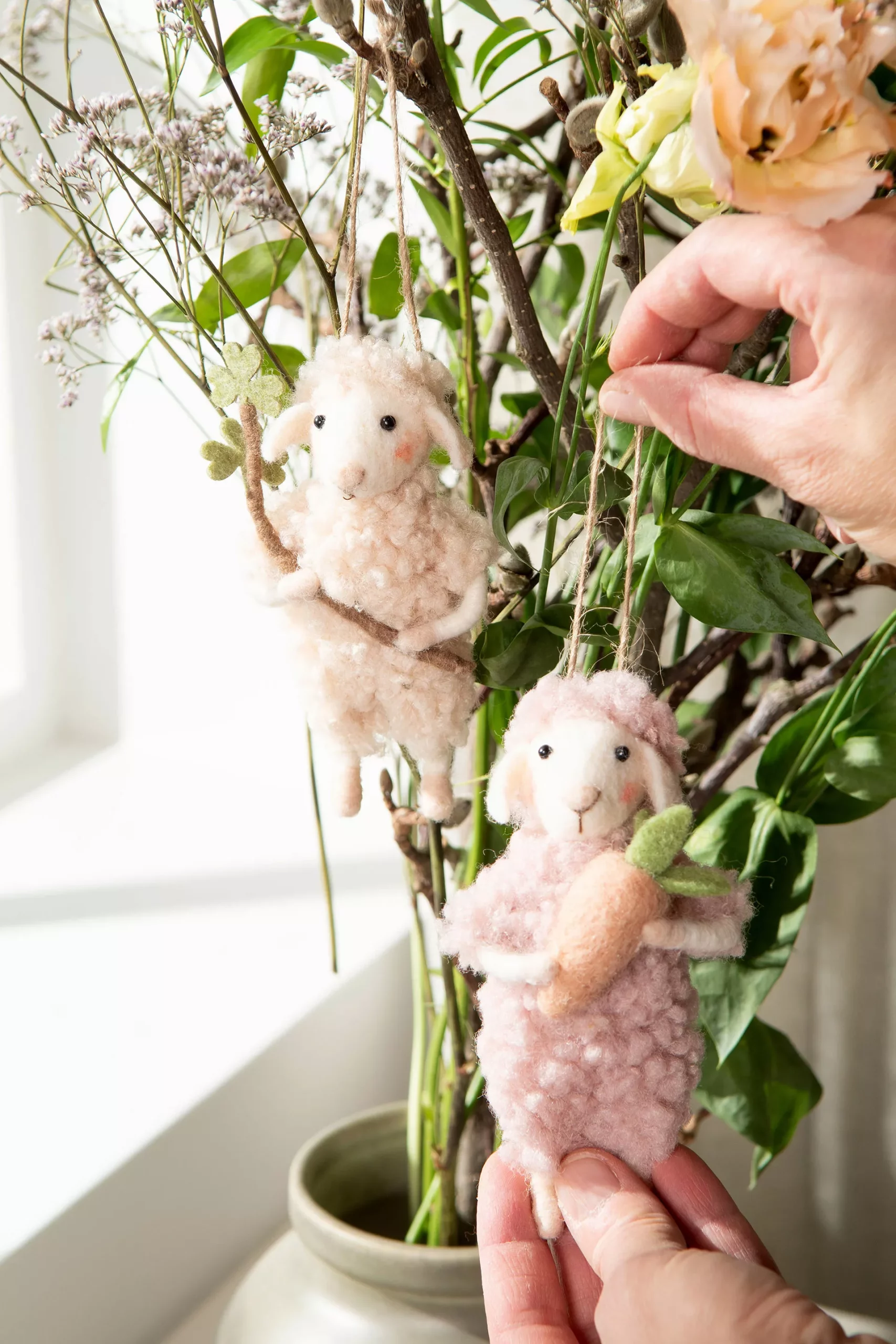 Gulligt ulldjur i form av ett rosa lamm som håller i en morot. Tråd för att kunna hänga upp i påskriset.