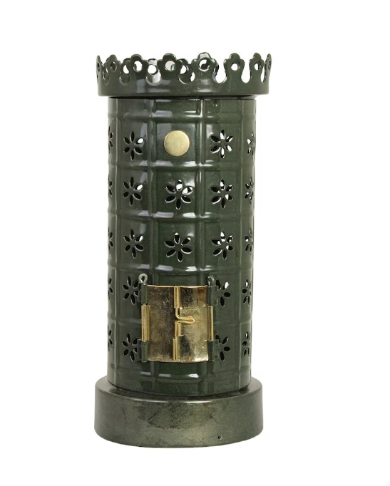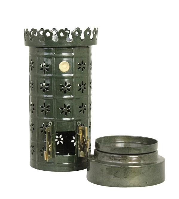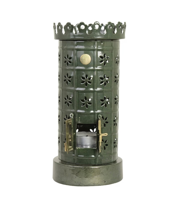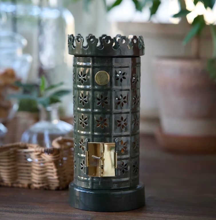 Vacker värmeljushållare i plåt med design inspirerad av en klassisk kakelugn i miniformat. Den mörkgröna marmorerade ytan och de perforerade partierna gör att ljuset från värmeljuset lyser ut på ett dekorativt sätt.