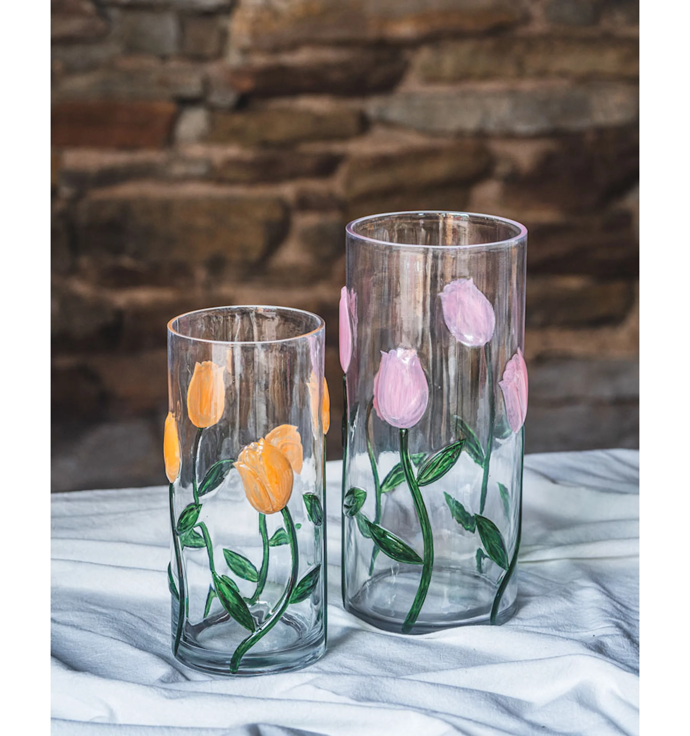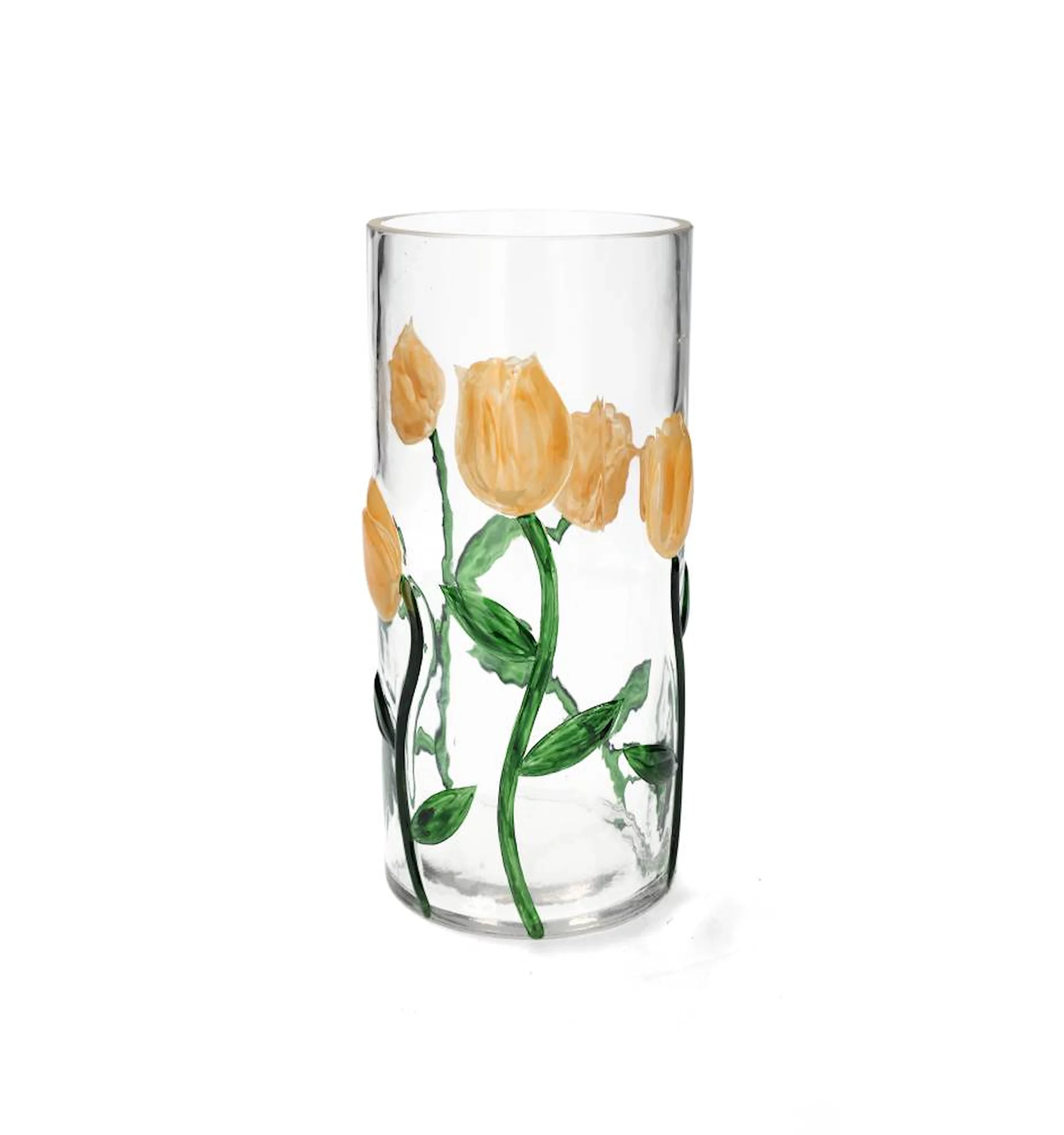 Sätt dina favoritblommor i denna fina vas med målade tulpaner. Tillverkad i glas.